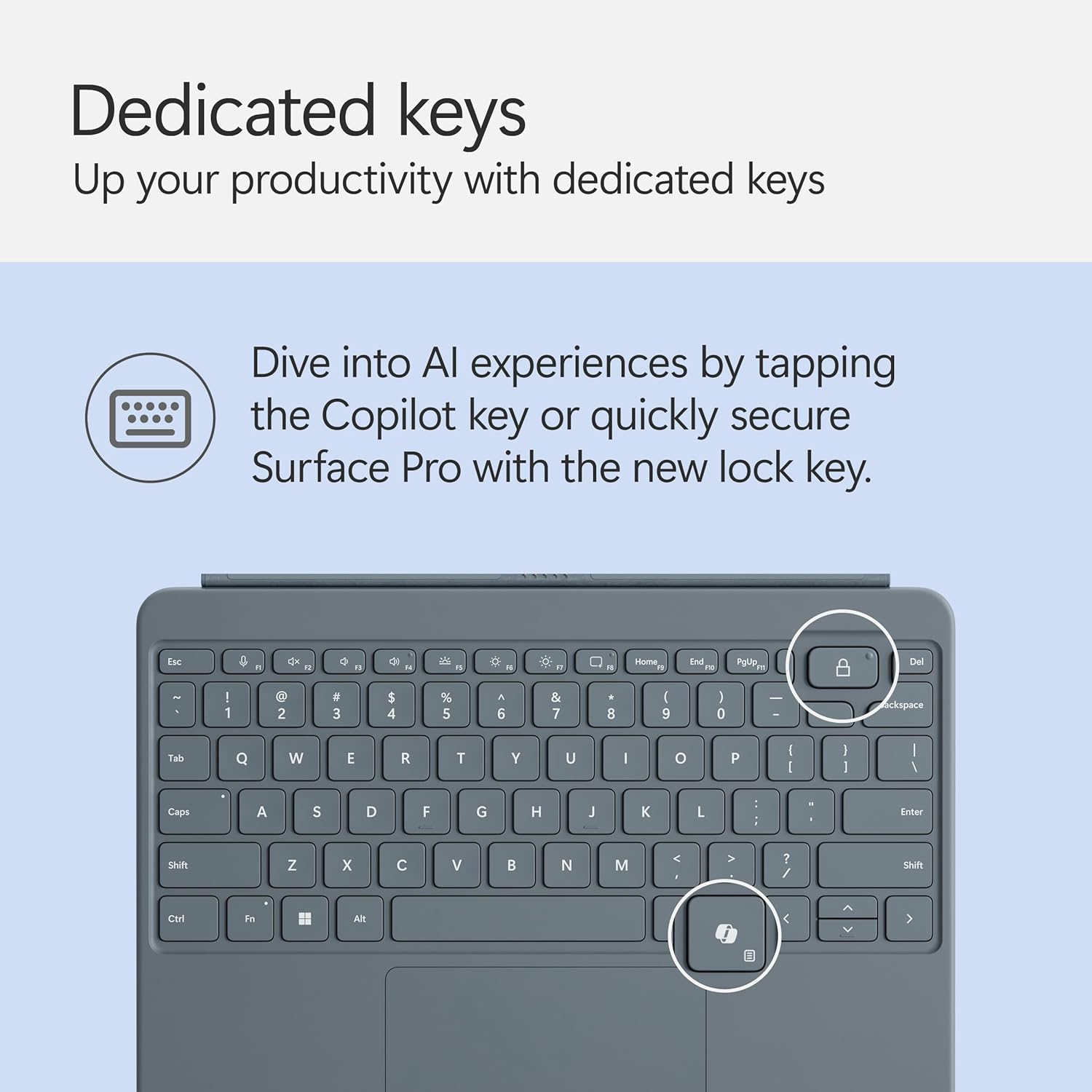 Instantly turn Surface Pro into a full laptop with the Surface Pro Keyboard, giving you more ways to work, create, and stay productive anywhere. Designed for Surface Pro 12”, this premium keyboard offers a responsive, laptop-like typing experience so you can work comfortably on the go. The new dynamic hinge flexes a full 360°, letting you type, draw, or stream from virtually any position.